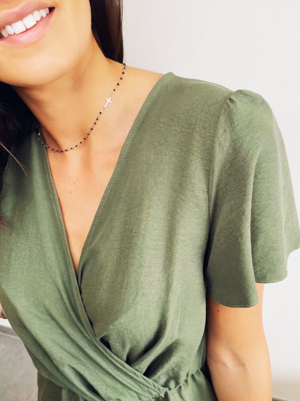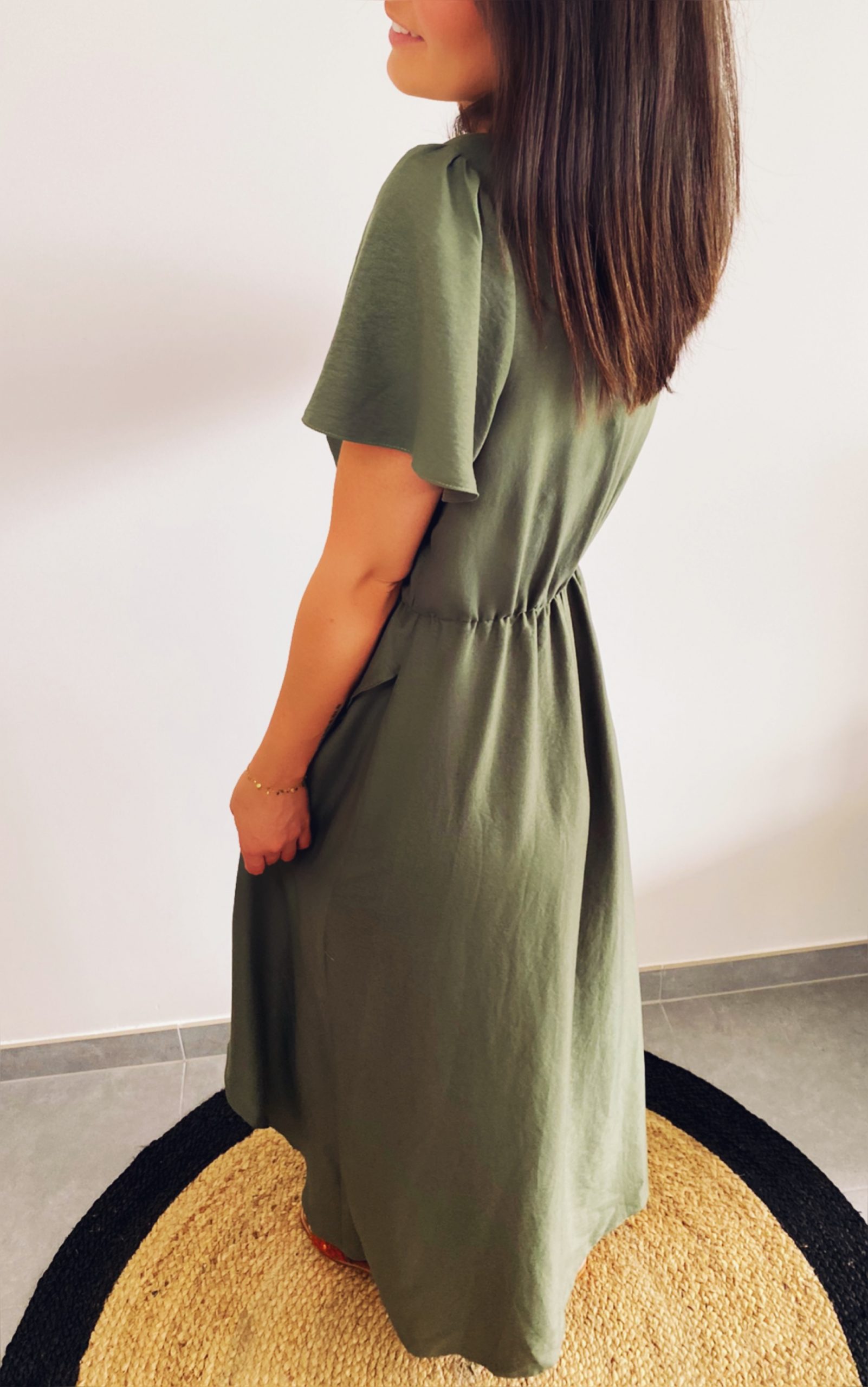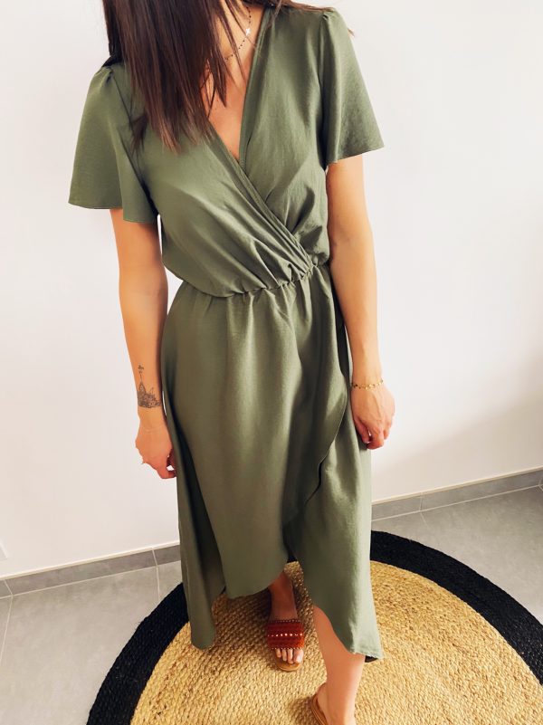 Sublime robe, tout en légèreté avec bustier cache-cœur qui offre un beau décolleté en V, manches courtes, élastique à la taille, coupe asymétrique avec pans croisés.